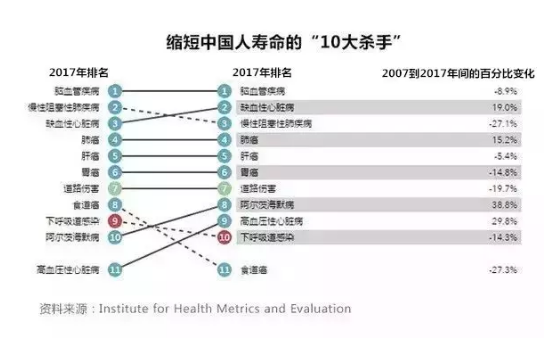 從2007年到2017年這十年間,縮短中國(guó)人壽命的第一位殺手依然是腦血管疾病,肺病疾病和心臟疾病也一直是危害中國(guó)人健康的重大疾病。