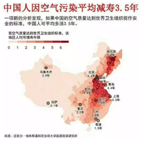 芝加哥大學(xué)能源政策研究所一份最新分析報(bào)告稱,空氣污染讓中國(guó)人預(yù)期壽命縮短了3.5歲;其中北京居民平均減壽6.4年,上海為5.5年,廣州為2.8年,拉薩為0.1年,哈爾濱等東北重工業(yè)城市,居民平均壽命最高可縮短6.9年。